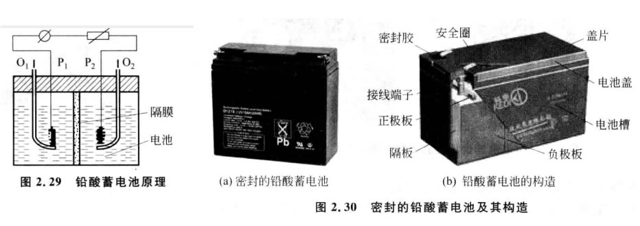 1859年,法國人普蘭特發(fā)明了鉛酸蓄電池,至今已有 150多年的發(fā)展歷程。鉛酸蓄電池在理論研究、產(chǎn)品種類 及品種、產(chǎn)品電氣性能等方面都得到了長足的進(jìn)步,在交 通、通信、電力、軍事、航海、航空等各個(gè)領(lǐng)域,鉛酸蓄電池都 起到了不可缺少的重要作用。鉛酸蓄電池的原理和構(gòu)造如 圖2.29和圖2.30所示,它是一種電極由鉛及其氧化物制成,電解液是硫酸溶液的蓄電池。鉛酸蓄電池在荷電狀態(tài)下,正極的主要成分是二氧化 鉛,負(fù)極主要成分為鉛。在放電狀態(tài)下,正負(fù)極的主要成分均為硫酸鉛。
