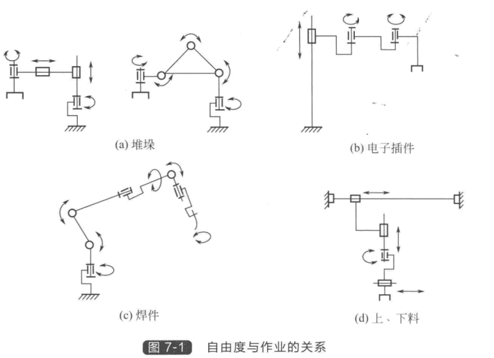 ③確定機(jī)器人的自由度。機(jī)器人在持重和工作空間上滿足對機(jī)器人工作站或生產(chǎn)線的 功能要求之后,還要分析它是否可以在作業(yè)范圍內(nèi)滿足作業(yè)的姿態(tài)要求。如圖7 - 1(a) 所 示 的簡單堆垛作業(yè),作為末端執(zhí)行器的夾爪,只需繞垂直軸的1個(gè)旋轉(zhuǎn)自由度,再加上機(jī)器人 本體的3個(gè)圓柱坐標(biāo)自由度,4個(gè)自由度的圓柱坐標(biāo)機(jī)器人即可滿足要求。若用垂直關(guān)節(jié)型 機(jī)器人,由于上臂常向下傾斜,又需手腕擺動的自由度,故需5個(gè)自由度的垂直關(guān)節(jié)型機(jī)器 人。圖7 - 1(b) 表示電子插件作業(yè),常使用4個(gè)自由度水平關(guān)節(jié)的SCARA 機(jī)器人。為了焊 接復(fù)雜工件, 一 般需要6個(gè)自由度。如果焊體簡單,又使用變位機(jī),在很多情況下5個(gè)自由 關(guān)節(jié)機(jī)器人即可滿足要求。自由度越多,機(jī)器人的機(jī)械結(jié)構(gòu)與控制就越復(fù)雜,所以在通常情 況下,如果少自由度能完成的作業(yè),就不要盲目選用更多自由度的機(jī)器人去完成。