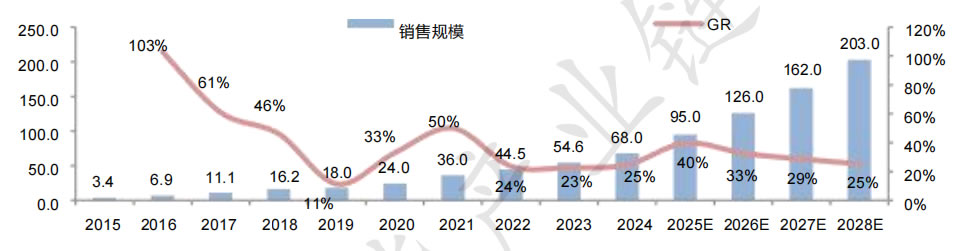 穩(wěn)步期(2022-2024 年)這一階段,經(jīng)濟(jì)形勢(shì)更加復(fù)雜,地域沖突、供應(yīng)鏈吃緊、美元加息等都對(duì)下游投資產(chǎn)生了較大的影響。在終端縮減自動(dòng)化投資的背景下,協(xié)作機(jī)器人憑借靈活部署、提效降本的優(yōu)勢(shì), 解決了許多制造業(yè)企業(yè)的柔性自動(dòng)化改造難題,市場(chǎng)增速雖有放緩,但仍保持良好增長(zhǎng)。協(xié)作機(jī)器人展現(xiàn)出了其發(fā)展的強(qiáng)勁韌性與潛力。