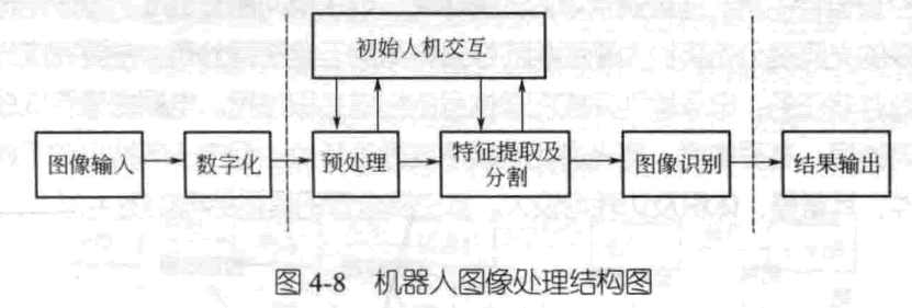 ③處理結(jié)果輸出(機機接口和人機接□):識別信息的輸出是圖像處理的 Z終目的。從廣義的角度講,信息的輸出形式可分為兩種:一種是根據(jù)識別的結(jié) 果作出判斷,通常以符號信息的形式輸出;另一種是以圖像形式輸出。機器人圖 像處理的結(jié)構(gòu)圖如圖4-8所示。