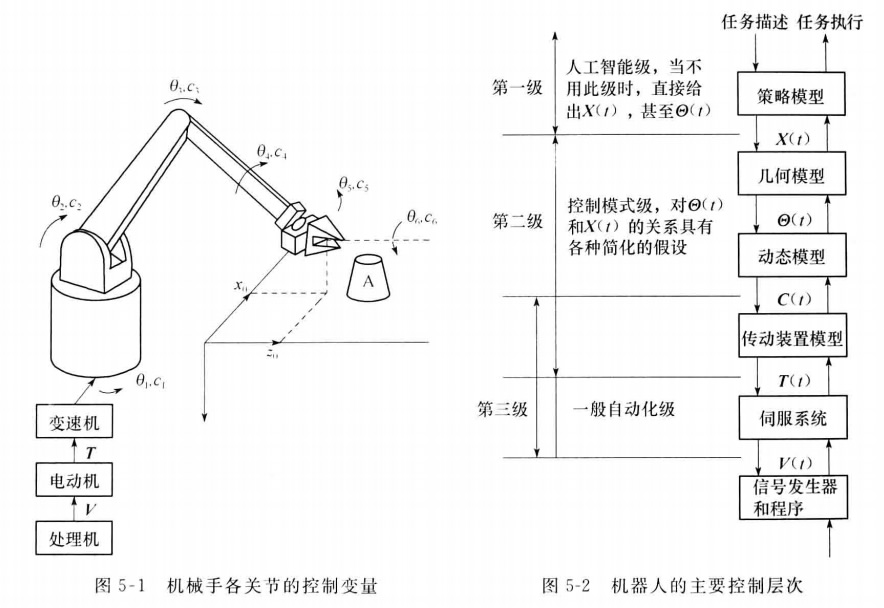 圖5-2表示機器人的主要控制層次。由圖可見,它主要分為三個控制J,即人工智能 J、控制模式J和伺服系統(tǒng)J。現(xiàn)對它們進一步討論如下。