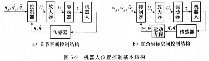 在圖5-9b 中 ,wu=[pl,φI] 是期望的工具位姿,其中p=[xd,ya,zu] 表示期望 的工具位置, qu 表示期望的工具姿態(tài)。 w=[v,wJ], 其 中 va=[v,V4,v] 是期 望的工具線速度, w=[wa,,wa,wd] 是期望的工具角速度, wa 是期望的工具加速度, w 和w 表示實際的工具位姿和工具速度。運行中的工業(yè)機器人一般采用圖5-9a 所示控制結(jié) 構(gòu)。該控制結(jié)構(gòu)的期望軌跡是關(guān)節(jié)的位置、速度和加速度,因而易于實現(xiàn)關(guān)節(jié)的伺服控 制。這種控制結(jié)構(gòu)的主要問題是:由于往往要求的是在直角坐標空間的機械手末端運動軌 跡,因而為了實現(xiàn)軌跡跟蹤,需將機械手末端的期望軌跡經(jīng)逆運動學(xué)計算變換為在關(guān)節(jié)空 間表示的期望軌跡。