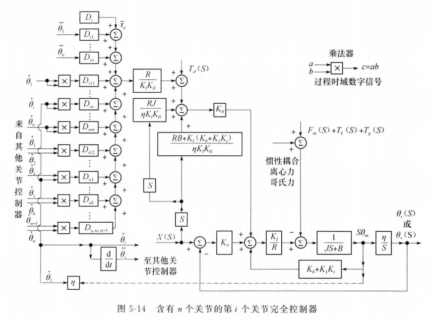 式(4.24)中的第三項(xiàng)和第四項(xiàng)分別表示向心力和哥氏力的作用。這些力矩項(xiàng)也需要前 饋輸入至關(guān)節(jié)i 的控制器,以補(bǔ)償各關(guān)節(jié)間的實(shí)際互相作用,亦示于圖5-14上。圖中畫出 了工業(yè)機(jī)器人的關(guān)節(jié)i(i=1,2,…,n) 控制器的完整框圖。要實(shí)現(xiàn)這 n 個(gè)控制器,需要 計(jì)算具體機(jī)器人的各前饋元件的 D,,D; 和D, 值 。