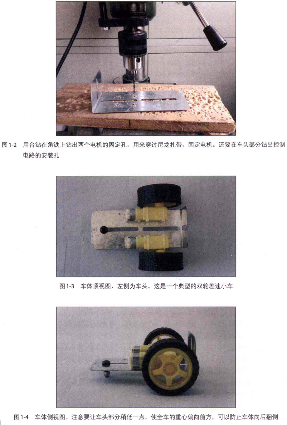 下面開(kāi)始制作機(jī)器人的身體。身體是一個(gè)由兩個(gè)電機(jī)驅(qū)動(dòng)的可以自由活動(dòng)的小 車式底盤。身體相當(dāng)于機(jī)器人的骨架,機(jī)器人的傳感器和控制器都搭載在它上面。 車輪和電機(jī)構(gòu)成了機(jī)器人的運(yùn)動(dòng)器官。