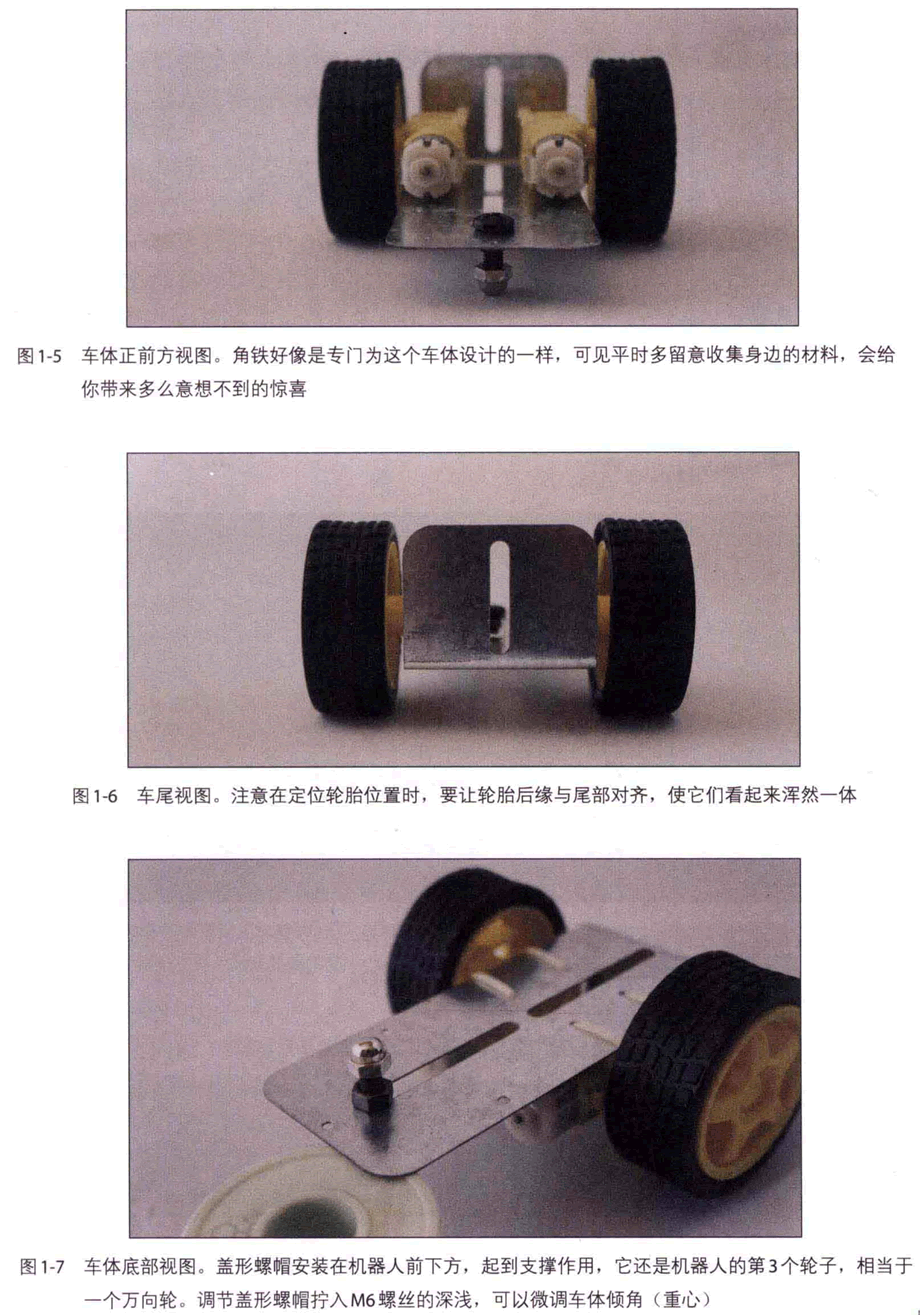 車體的裝配方法如圖1-2~圖1-7所示。讀者也可以發(fā)揮創(chuàng)造力,設(shè)計(jì)結(jié)構(gòu)更精巧的車體。