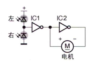 讓我們?cè)囍谩暗图夹g(shù)”的方式進(jìn)行思考, 一個(gè)可以在二維平面上跟蹤光線的 伺服系統(tǒng)可以有多簡(jiǎn)單呢?請(qǐng)看圖1-14,只需要4個(gè)元器件:兩個(gè)光敏二極管、 一 片數(shù)字邏輯集成電路、一個(gè)減速電機(jī)。這些元器件都是電子愛(ài)好者工作室里常備的 材料,它們真的可以制作出一個(gè)能夠正常工作的自動(dòng)控制系統(tǒng)嗎?答案是肯定的, 這個(gè)電路可以作為學(xué)習(xí)自動(dòng)控制系統(tǒng)的一塊敲門磚。