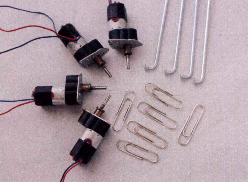 機(jī)器人對(duì)電機(jī)的要求不高,只要體積小巧、輸出軸為3mm (方便和接線端子 芯改裝的簡(jiǎn)易軸連器連接)、轉(zhuǎn)速不要太快(比較理想的數(shù)值是20r/min以 下 ) 就 可以了。車條和曲別針是隨手可得的常見(jiàn)材料,接下來(lái)就考驗(yàn)?zāi)愕氖止ち恕?