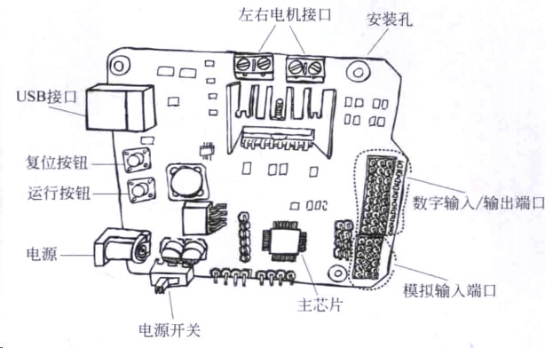 機器人套件里形形色色的傳感器和執(zhí)行器是如何連接到主控制器上的呢?大家拿出主控器,可以看到它的上面有很多金屬插針,對應(yīng)于圖4-1中數(shù)字輸入/輸出端口、模擬輸 入端口的位置,這些插針是我們連接所有傳感器、執(zhí)行器的插口。