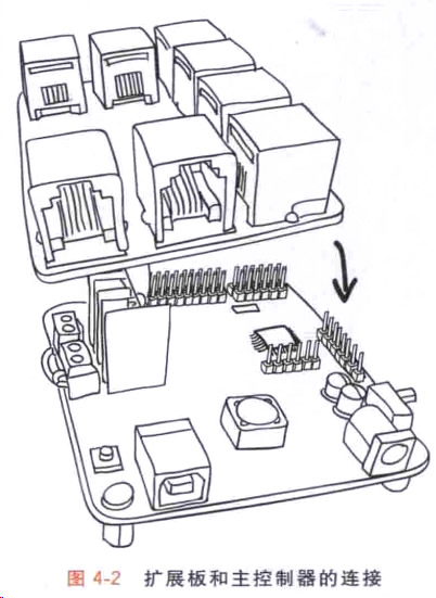 圖4 - 2是我們?yōu)闄C器人配備的 擴展接線板。將它和主控制器插到 一起后,就 能很方便地用灰色的RJ11 線連接各種傳感器 和執(zhí)行器,而不用擔(dān)心線路連錯或連反。