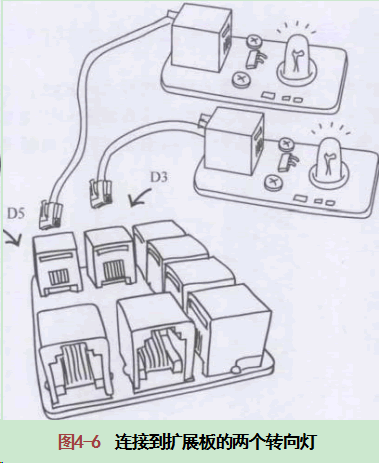 將機(jī)器人、擴(kuò)展板和小燈模塊連接好,將右轉(zhuǎn)向燈連接D5 號口,左轉(zhuǎn)向燈連接D3號口,如圖4-6所示。