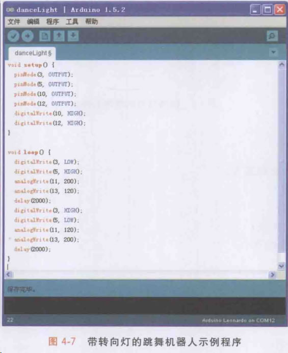 這4條語句會讓連接5號口的右轉(zhuǎn)向燈點亮,左轉(zhuǎn)向燈熄滅,同時機(jī)器人向右轉(zhuǎn)彎 (順時針轉(zhuǎn)圓圈)。