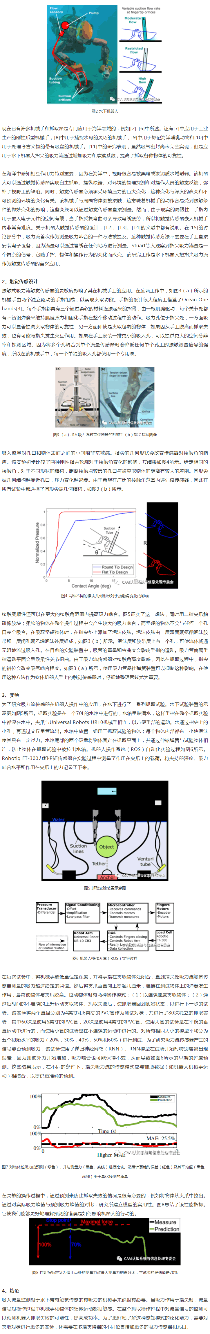 在海洋探索中,水下機器人能在深海或冰下進行海洋資源調(diào)查、估價、勘探、海底地形地貌攝影與繪圖、海底采樣、水文調(diào)查、海底石油管道與電纜的檢測與維修、海洋石油平臺和海洋工作站的檢測維護等[1]。而在水下進行抓取和移動的雙手可以使水下機器人平臺更好地應對具有挑戰(zhàn)性的場景。面向水下機器人的靈巧操作,加州伯克利大學在ICRA2020發(fā)表了一篇“Tactile sensing based on fingertip suction flow for submergeddexterous manipulation”的論文。作者引入了一種新型的觸覺傳感方法,在柔順的手的指尖處使用溫和的吸力流,如圖2所示,可以方便地應用到水下機器人。該方案的一個大好處是泵和傳感器可以安裝在靠近手臂的機器人底座上進行保護,并實現(xiàn)與機械手遠程連接。