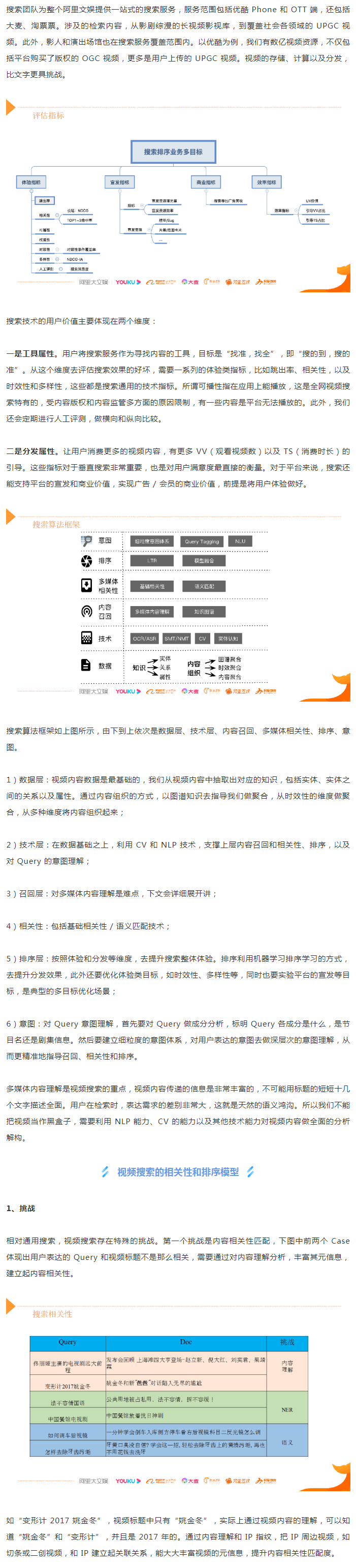 考慮到大家來(lái)自不同的業(yè)務(wù)L域和技術(shù)方向,我會(huì)先簡(jiǎn)單介紹優(yōu)酷視頻搜索的業(yè)務(wù)背景,同時(shí)快速介紹搜索的基本評(píng)估指標(biāo)、搜索系統(tǒng)的算法框架以及相關(guān)性和排序模型,讓大家對(duì)視頻搜索有一個(gè)更多面的認(rèn)識(shí),后面重點(diǎn)介紹多模態(tài)視頻搜索相關(guān)技術(shù)。