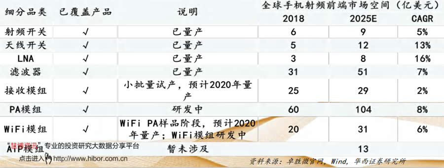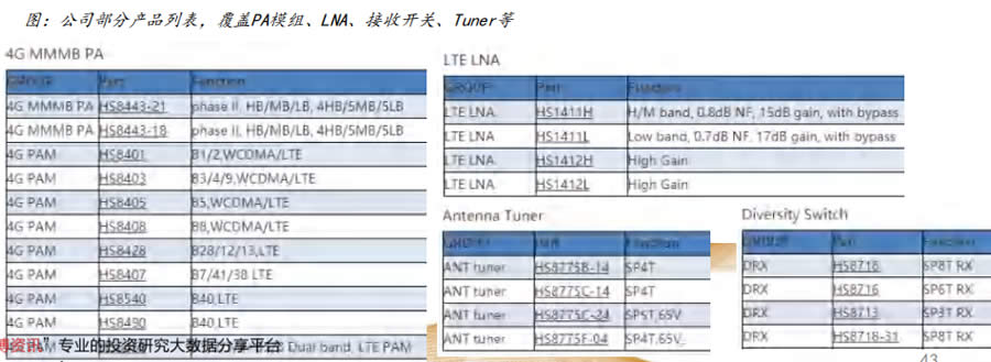 公司以射頻開關(guān)、LNA芯片起家,實(shí)現(xiàn) L先手機(jī)品牌如三星、小米、華為、vivo、OPPO等重點(diǎn)客戶覆蓋,并在2019年實(shí)現(xiàn)射 頻模組產(chǎn)品從無到有的突破。在細(xì)分產(chǎn)品中,比較優(yōu)勢明顯,射頻開關(guān)已通過G通的小批 量試產(chǎn)驗(yàn)證,正式進(jìn)入量產(chǎn)。DiFEM的成功研制是公司技術(shù)創(chuàng)新的又一里程 碑,打破了海外寡頭在射頻模組L域的壟斷局勢。站在當(dāng)前時點(diǎn),公司營收體量小,所處 賽道面向250億美元市場,具備5G換機(jī)潮和射頻芯片國產(chǎn)替代的雙重彈性。