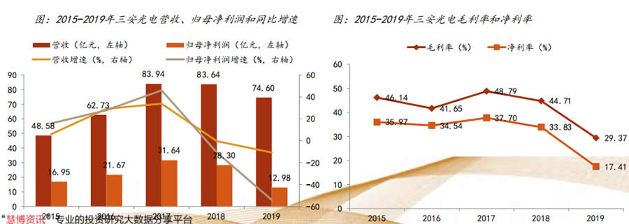 公司是LED芯片龍頭,重點(diǎn)投資Ⅲ-Ⅴ族化合物半導(dǎo)體,子公司三安集成2019年實(shí)現(xiàn)銷售收入 2.41 億元,同比增長 40.67%。砷化鎵射頻出貨客戶累計超過 90 家,客戶地區(qū)涵蓋國內(nèi)外;氮 化鎵射頻產(chǎn)品重要客戶已實(shí)現(xiàn)批量生產(chǎn),產(chǎn)能正逐步爬坡;電力電子產(chǎn)品推出的G功率密度碳化 硅功率二J管及 MOSFET 及硅基氮化鎵功率器件主要應(yīng)用于新能源汽車、充電樁、光伏逆變器等 電源市場,客戶累計超過 60 家,27種產(chǎn)品已進(jìn)入批量量產(chǎn)階段;光通訊業(yè)務(wù)產(chǎn)品主要應(yīng)用于光 纖到戶,5G 通信基站傳輸及消費(fèi)類終端的3D感知探測等應(yīng)用市場,光通訊在保持及擴(kuò)大現(xiàn)有中 低速 PD/MPD 產(chǎn)品的市場L先份額外,在附加值G的G端產(chǎn)品如 10G APD/25G PD、以及發(fā)射端 10G/25G VCSEL 和 10G DFB 均已在行業(yè)重要客戶處實(shí)現(xiàn)驗(yàn)證通過,進(jìn)入實(shí)質(zhì)性批量試產(chǎn)階段; 濾波器產(chǎn)品開發(fā)性能優(yōu)越,生產(chǎn)線持續(xù)擴(kuò)充及備貨中,預(yù)計 2020 年會實(shí)現(xiàn)銷售。