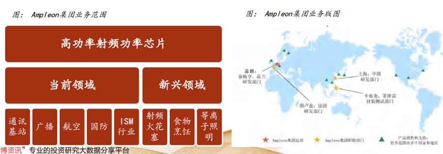 Ampleon集團(tuán)原為著名半導(dǎo)體企業(yè)NXP的射頻功率部門,在射頻功率芯片行業(yè)擁有超過 50年的運(yùn)營經(jīng)驗(yàn),后經(jīng)剝離成立公司并由建廣資產(chǎn)成功競標(biāo)。根據(jù)研究機(jī)構(gòu)ABI Research 的統(tǒng)計,2016年Ampleon集團(tuán)在射頻功率半導(dǎo)體行業(yè)的市場占有率為19.6%,排名D二。 公司的射頻功率芯片主要供應(yīng)各大通訊基站設(shè)備制造商。Ampleon的經(jīng)營模式介于IDM模式 與Fabless模式之間,其業(yè)務(wù)涵蓋射頻功率芯片的設(shè)計、封裝測試以及終的銷售環(huán)節(jié),但 不包括晶圓采購、芯片制造及測試等中間環(huán)節(jié)。公司擁有Si LDMOS技術(shù)以及一代G端 半導(dǎo)體射頻氮化鎵技術(shù),GaN業(yè)務(wù)主要通過由晶圓廠商(UMS)代工的方式實(shí)現(xiàn)產(chǎn)品出貨。 公司基站芯片業(yè)務(wù)占業(yè)務(wù)總收入的88%。
