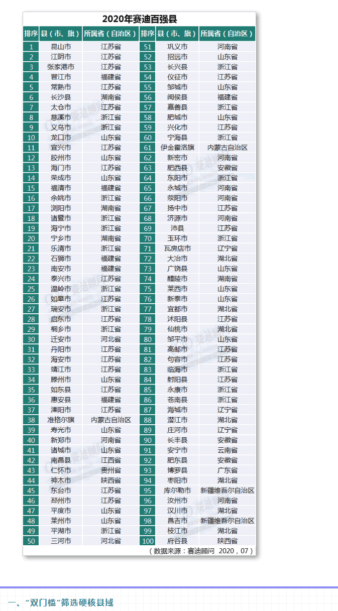 2020年7月28日,由賽迪顧問縣域經(jīng)濟(jì)研究中心編制的《2020中國縣域經(jīng)濟(jì)百強(qiáng)研究》正式發(fā)布。該研究聚焦新時代縣域G質(zhì)量發(fā)展的新動力、新機(jī)制,多面解讀了縣域百強(qiáng)的區(qū)域格局和發(fā)展特征。