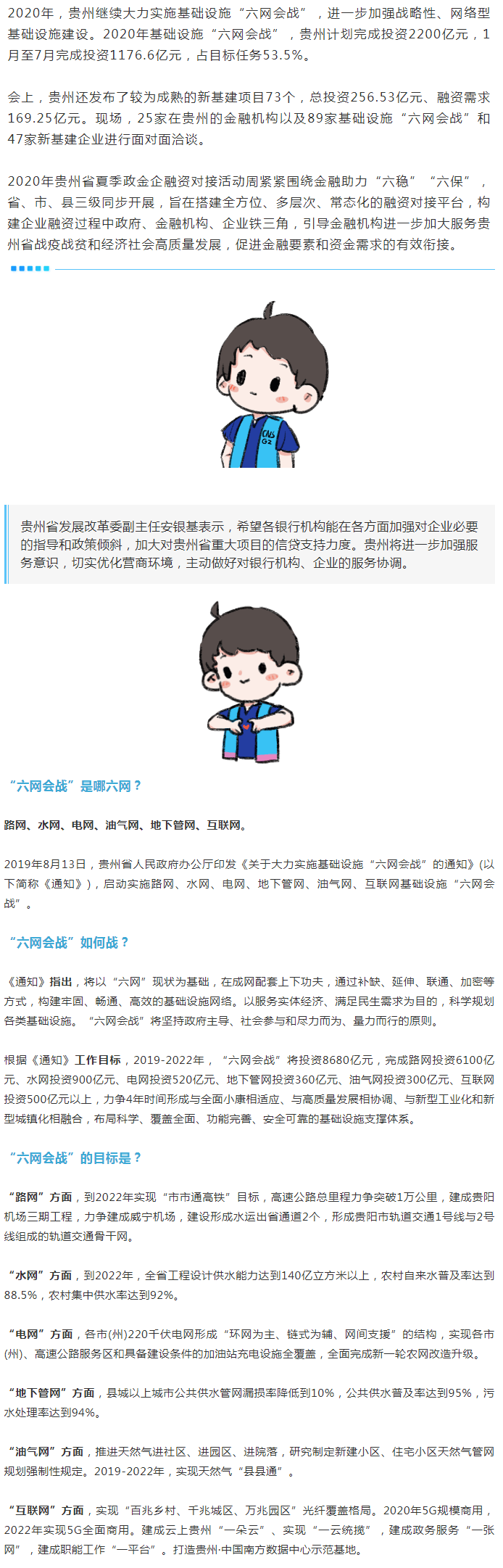 8月6日,2020年貴州省夏季政金企融資對接活動周基礎(chǔ)設(shè)施“六網(wǎng)會戰(zhàn)”和新基建項目融資洽談會在貴陽舉行。會上,省發(fā)展改革委向金融機構(gòu)發(fā)布了“六網(wǎng)會戰(zhàn)”和新基建項目261個,總投資5477.98億元、融資需求3290.53億元。其中,新基建項目73個,總投資256.53億元、融資需求169.25億元。25家在黔金融機構(gòu)與89家基礎(chǔ)設(shè)施“六網(wǎng)會戰(zhàn)”和47家新基建項目建設(shè)單位進行了面對面洽談。