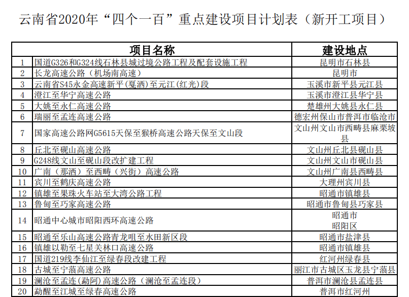 云南省2020年“四個(gè)一百”重點(diǎn)建設(shè)項(xiàng)目計(jì)劃表(新開(kāi)工項(xiàng)目)