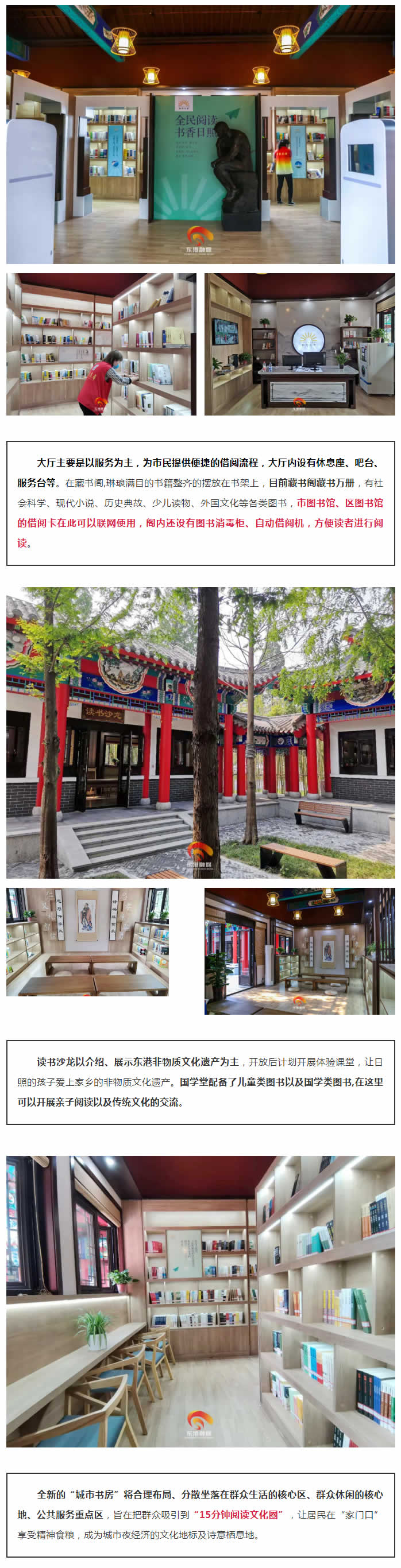 從城市書房的正門進入,一眼就被城市書房的建筑造型所吸引。這里采用四合院院落布局設計,建筑造型均采用古建筑的設計風格,J具傳統(tǒng)特色。走入書房內(nèi)部,這里分為服務大廳、藏書閣、讀書沙龍、國學堂幾大區(qū)域,庭院中綠樹成蔭,設有座椅供市民休憩,營造出了濃濃的文化和藝術氛圍。