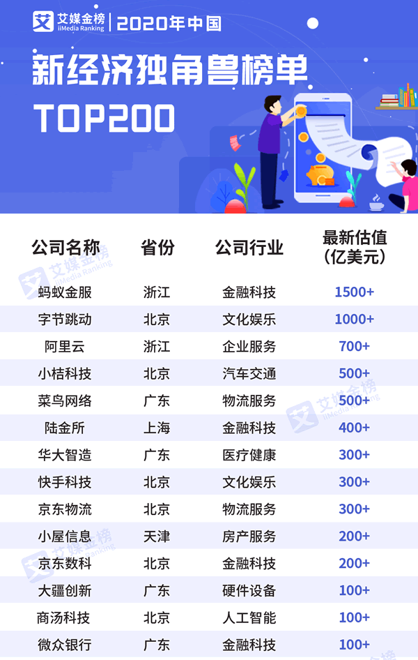 近日,數(shù)據(jù)挖掘和分析機(jī)構(gòu)iiMedia Research(艾媒咨詢)權(quán)威發(fā)布《2020中國新經(jīng)濟(jì)獨(dú)角獸200強(qiáng)榜單》。本排行榜中企業(yè)評選對象為估值超過10億美元的未上市企業(yè),相關(guān)信息統(tǒng)計(jì)截至2020年7月10日。