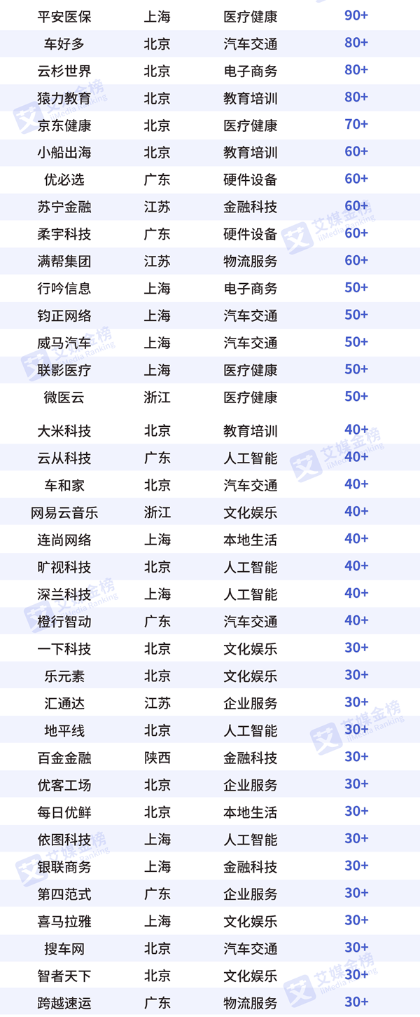 字節(jié)跳動,螞蟻金服,滴滴出行,快手,陸金所,菜鳥網(wǎng)絡(luò),京東數(shù)科,微眾銀行,馬上金融,商湯科技,京東物流,曠視科技,優(yōu)必選