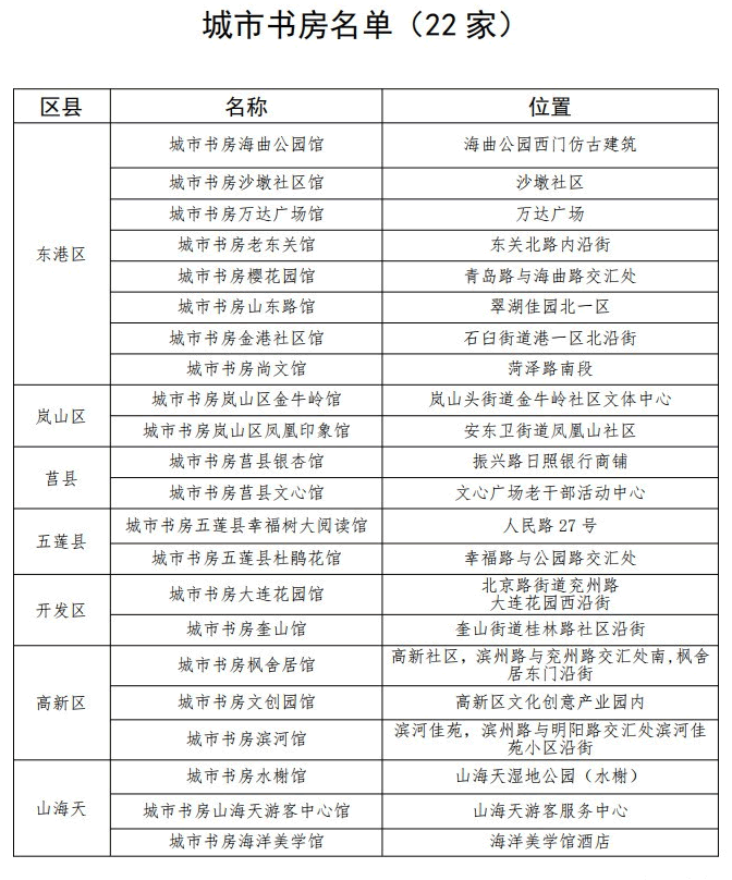 環(huán)衛(wèi)所城市書房(環(huán)翠路南段,興業(yè)新營(yíng)華府西門) 運(yùn)總集團(tuán)城市書房(黃海二路11號(hào)) 石臼街道城市書房(黃海一路與海濱五路交匯處) 開發(fā)區(qū)中心公園城市書房(天津路72號(hào))