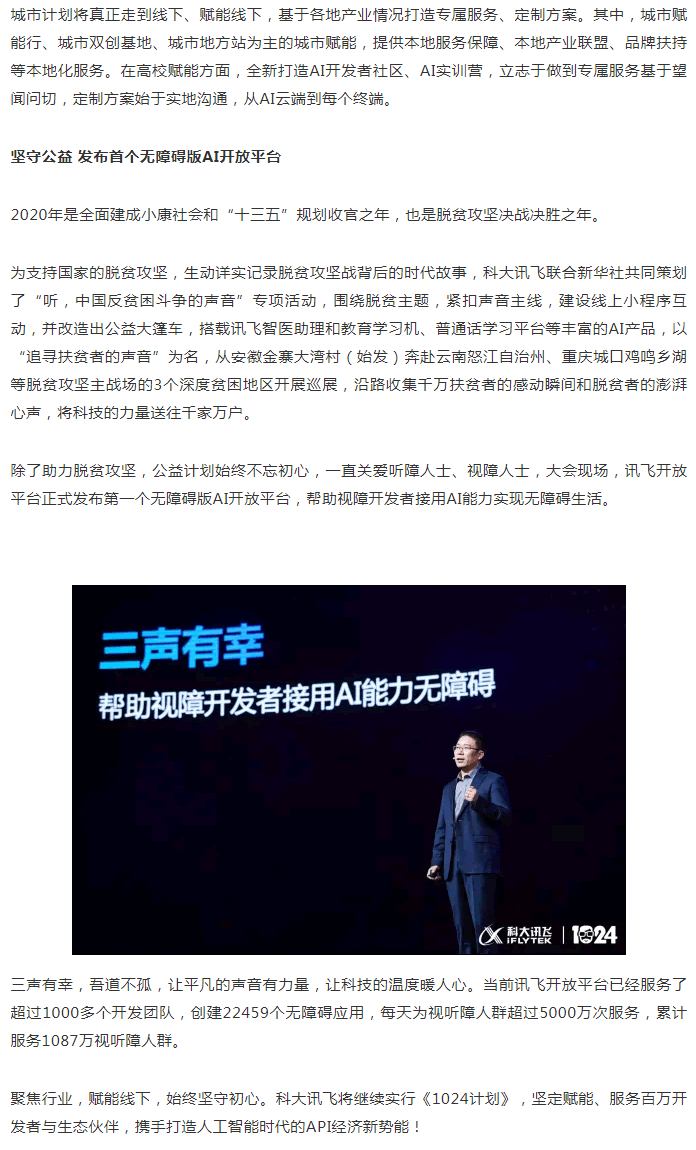 科大訊飛1024計(jì)劃全新升級(jí)為“AI賦能計(jì)劃”,發(fā)布聚焦行業(yè)的先導(dǎo)計(jì)劃、賦能線下的城市計(jì)劃、堅(jiān)守初心的公益計(jì)劃。“我們將從產(chǎn)品賦能走向行業(yè)賦能,實(shí)現(xiàn)進(jìn)階服務(wù),為生態(tài)和應(yīng)用的發(fā)展提供更契合的A.I.源動(dòng)力! 胡國(guó)平表示。