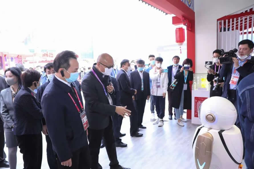 2020年11月5日,山東省委副書記、省長李干杰等L導(dǎo)在進(jìn)博會巡展時,智能迎賓講解機(jī)器人“創(chuàng)創(chuàng)”在廣場“至誠山東”展區(qū)熱情接待了李干杰省長一行。