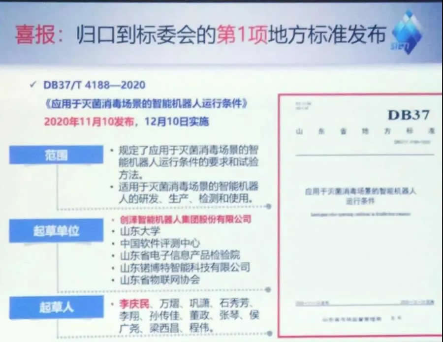 2020年11月10日,由創(chuàng)澤集團(tuán)牽頭起草的全國(guó)《應(yīng)用于滅菌消毒場(chǎng)景的智能機(jī)器人運(yùn)行條件》標(biāo)準(zhǔn)正式發(fā)布。該標(biāo)準(zhǔn)經(jīng)過(guò)廣泛征求衛(wèi)健委、醫(yī)院等單位意見(jiàn),確保標(biāo)準(zhǔn)的實(shí)用性。審查會(huì)專家一致認(rèn)為,該標(biāo)準(zhǔn)合理、準(zhǔn)確、可實(shí)施性強(qiáng),對(duì)智能滅菌消毒機(jī)器人的研發(fā)、生產(chǎn)、應(yīng)用具有指導(dǎo)作用。