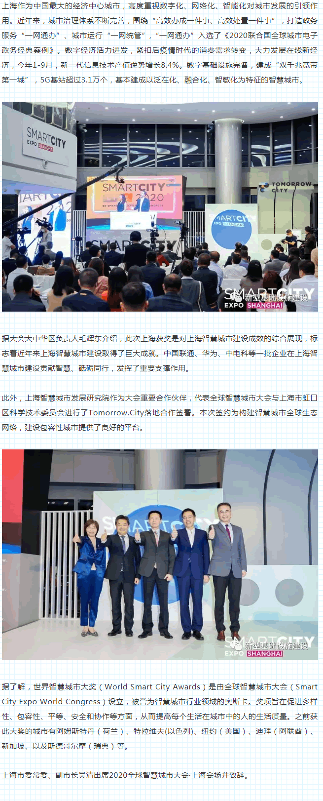 11月18日晚,2020智慧城市大會(Smart City Expo World Congress,簡稱SCEWC)正式發(fā)布世界智慧城市大獎獲獎名單。在350個城市中,上海脫穎而出,獲得G殊榮——世界智慧城市大獎。這是中國城市首次獲得該獎項,代表上海的智慧城市建設成效卓著,得到來自的廣泛關注和G度認可。