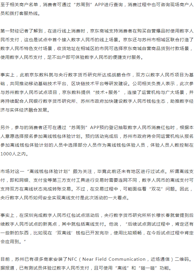 蘇州數(shù)字人民幣消費紅包活動的開展,也反映了我國數(shù)字人民幣的試點工作正穩(wěn)步推進。而和此前深圳開展紅包試點不同的是,本次蘇州數(shù)字人民幣紅包活動還支持消費者通過京東商城進行線上消費。