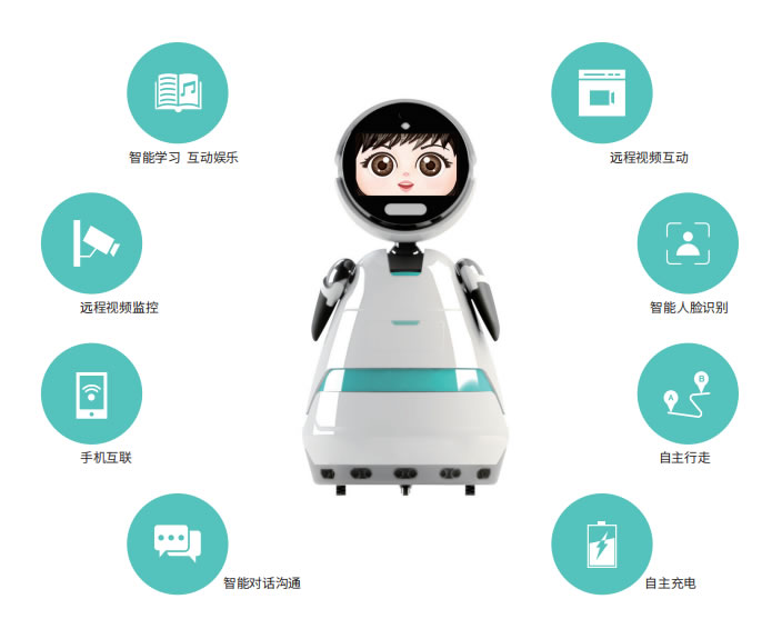 智能陪伴機(jī)器人采用機(jī)器人視覺系統(tǒng)、深度語音交互系統(tǒng)、先進(jìn)的語音引擎,搭載環(huán)形麥克風(fēng)陣列,運(yùn)用聲控識(shí)別、語義理解、人臉識(shí)別、情緒識(shí)別等關(guān)鍵技術(shù),在感知傳感器進(jìn)行穩(wěn)定準(zhǔn)確地行走、語音合成、理解與識(shí)別。機(jī)器人采用云平臺(tái)加本地化語音庫支持各種信息顯示,表情展示、觸摸輸入等人工交互過程。上位機(jī)采用 Linux 與 Android 操作系統(tǒng)通過串口方式與下位機(jī)通信,控制部分通過 Can 通信方式連接各種傳感器采集外部信息。整個(gè)軟件系統(tǒng)包括機(jī)器人端、服務(wù)器端、手機(jī)端,通過網(wǎng)絡(luò)通信方式完成機(jī)器人互聯(lián)。產(chǎn)品具備娛樂、早教、陪護(hù)、安防等功能,可用于家庭陪護(hù)教育及遠(yuǎn)程監(jiān)控防護(hù)。