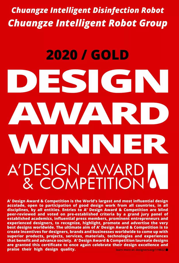 意大利A" Design Award是目前世界上大型的綜合性設(shè)計比賽,被譽(yù)為歐洲設(shè)計界的奧斯卡,是L先的國際年度設(shè)計賽事。也是ICSID(國際工業(yè)設(shè)計協(xié)會)、ICOGRADA(國際平面設(shè)計協(xié)會)、ADI (意大利工業(yè)設(shè)計協(xié)會)所認(rèn)可的國際設(shè)計賽事。 2020年至2021年,意大利A" Design Award設(shè)計大賽共收到來自2萬余件設(shè)計作品,所有參賽作品都是通過來自世界各地的學(xué)者、新聞界人士、設(shè)計師同行和行業(yè)專家所組成的頗具規(guī)模、影響力的設(shè)計獎評審團(tuán)進(jìn)行評審。此次,創(chuàng)澤集團(tuán)智能消毒殺菌機(jī)器人在眾多設(shè)計作品中脫穎而出榮獲意大利A"Design Award金獎,代表著設(shè)計界至G榮譽(yù),讓創(chuàng)澤集團(tuán)的設(shè)計作品閃耀于國際舞臺,同時也證明了創(chuàng)澤品牌在市場上的核心競爭力。