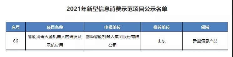 近日,國(guó)家工信部正式發(fā)布“2021年新型信息消費(fèi)示范項(xiàng)目公示名單”。創(chuàng)澤集團(tuán)的“智能消毒滅菌機(jī)器人的研發(fā)及示范應(yīng)用”項(xiàng)目,成功入選2021年新型信息消費(fèi)示范項(xiàng)目。