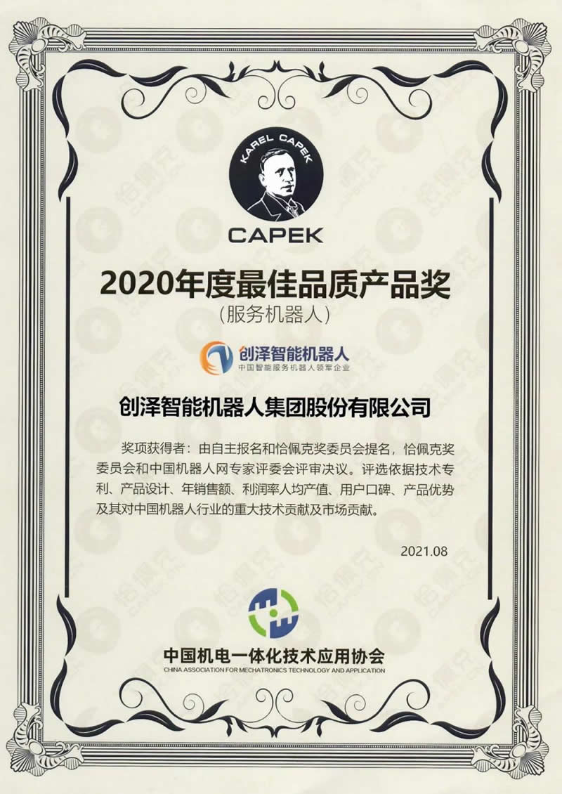 此次創(chuàng)澤集團憑借在人工智能和機器人L域的突出表現(xiàn),成功從恰佩克獎主辦方和評委會層層篩選中脫穎而出,榮獲恰佩克“2020年度佳品質產品獎”。這不僅意味著創(chuàng)澤集團的產品與技術受到恰佩克評委會的肯定,同樣證明創(chuàng)澤集團被行業(yè)內部的認可與肯定。