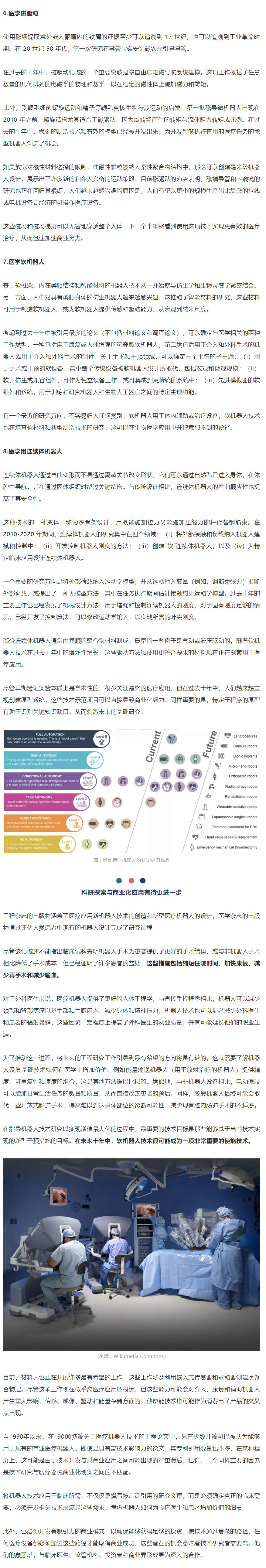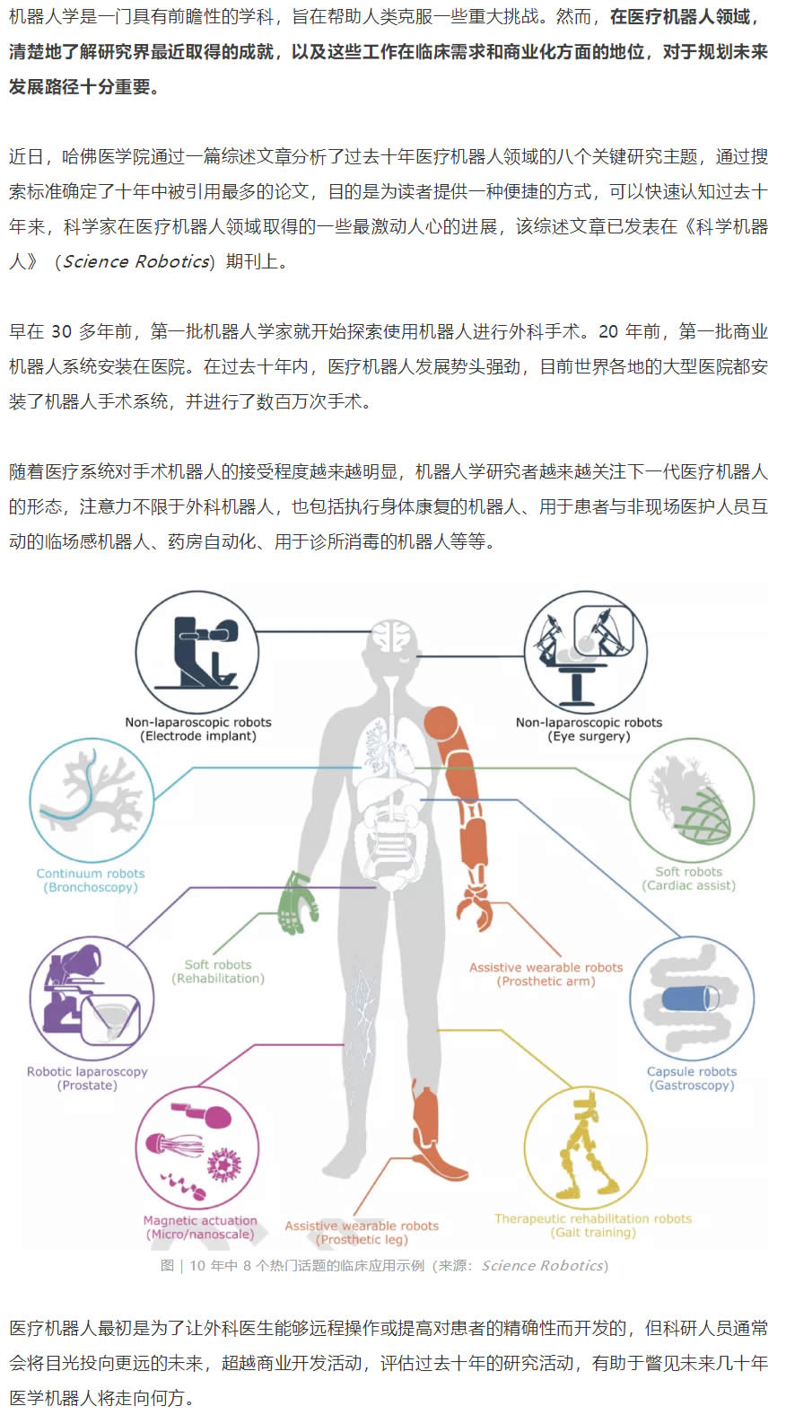 研究人員通過搜索 2010-2020 年期間《科學(xué)》雜志上被引用多的醫(yī)療機器人論文,確定了八個熱門研究主題,包括機器人腹腔鏡、用于微創(chuàng)手術(shù)的非腹腔鏡機器人、輔助穿戴式機器人、治療康復(fù)機器人、膠囊機器人、磁驅(qū)動、軟體機器人和連續(xù)體機器人等。