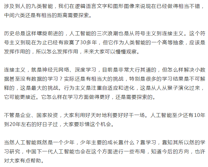 這個(gè)輪廓和布局看起來很圓滿,但遠(yuǎn)遠(yuǎn)不夠。如果看整個(gè)人工智能學(xué)科的輪廓,包括計(jì)算機(jī)視覺、語言識(shí)別、自然語言、人機(jī)交互、機(jī)器人學(xué)習(xí)等方向,目前大的布局是沉浸到應(yīng)用這個(gè)方面。