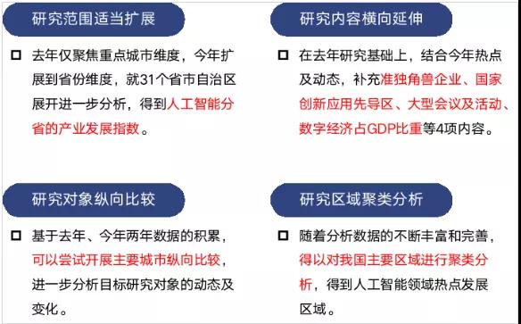 變化及亮點(diǎn)方面,今年AI指數(shù)在研究范圍、研究?jī)?nèi)容、研究對(duì)象、研究區(qū)域等維度均進(jìn)行了豐富和完善,包括從僅分析市級(jí)維度擴(kuò)展到省級(jí)維度、增加國(guó)家創(chuàng)新應(yīng)用先導(dǎo)區(qū)等指標(biāo)、增加年度縱向比較和區(qū)域聚類分析等,可以說亮點(diǎn)紛呈。