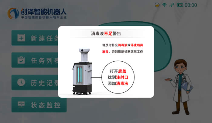 消毒機器人的屏幕還可以顯示消毒機器人運行過程中的狀態(tài)提醒,如上圖所示,當(dāng)消毒機器人的消毒液不多的時候,會在屏幕顯示添加消毒液的提醒信息。