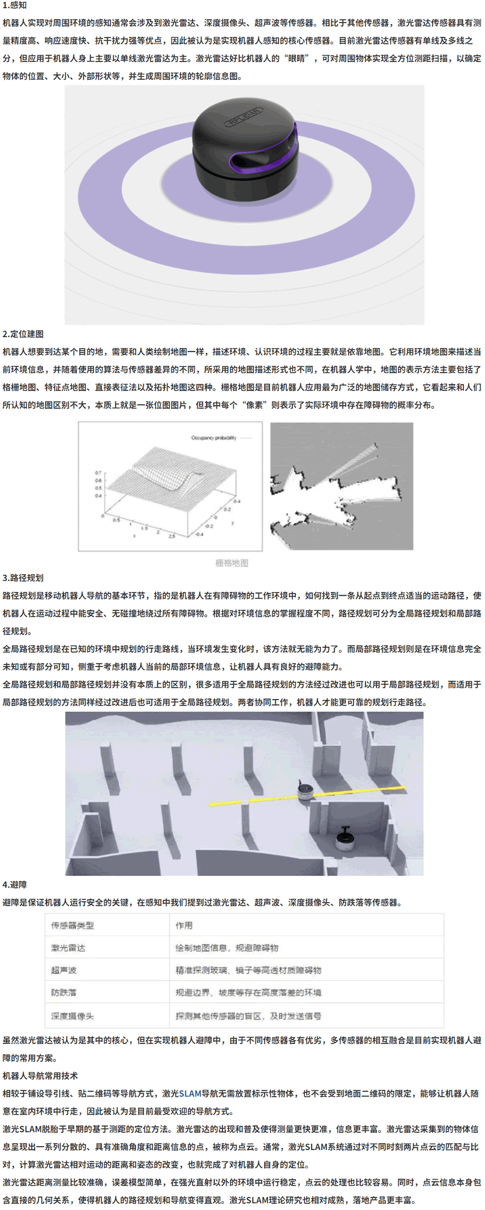 實現(xiàn)機器人導(dǎo)航的基本環(huán)節(jié)有四個步驟:感知、定位建圖、路徑規(guī)劃和避障