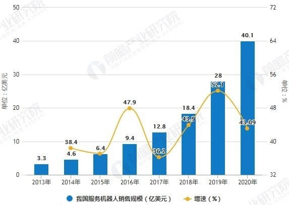 隨著人工智能技術(shù)的發(fā)展,我國服務(wù)機器人市場也迎來了爆發(fā)式增長,據(jù)前瞻產(chǎn)業(yè)研究院發(fā)布的《中國服務(wù)機器人行業(yè)發(fā)展前景與投資戰(zhàn)略規(guī)劃分析報告》統(tǒng)計數(shù)據(jù)顯示,2013-2018年整體處于飛速增長階段,2018年中國服務(wù)機器人市場規(guī)模有望達(dá)到18.4億美元,同比增長約45.3%,G于服務(wù)機器人市場增速。