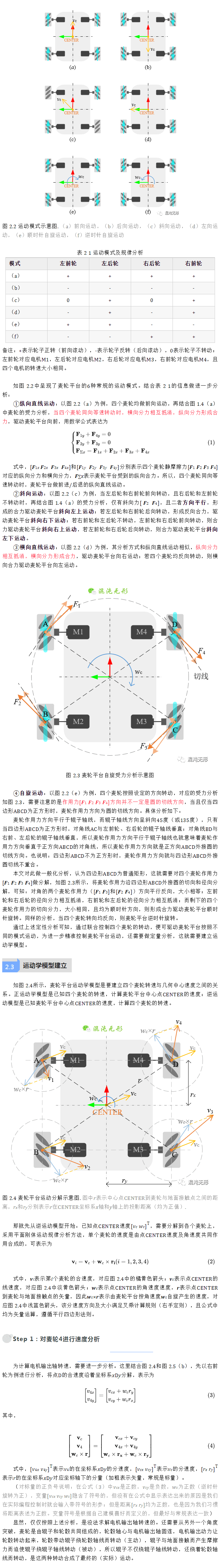 要滿足上述的分力能夠相互抵消的條件是麥輪(或電機(jī))轉(zhuǎn)速大小相同,因?yàn)槊總(gè)麥輪受到的地面支持力相同(基于假設(shè)①②),4個(gè)電機(jī)又勻速等速轉(zhuǎn)動(dòng),意味著電機(jī)輸出扭矩與地面作用于麥輪的摩擦力是平衡的,4個(gè)麥輪摩擦力在輪轂軸向和徑向上分解的大小是相同的,而速度分解與力分解類似,所以4個(gè)麥輪沿輪轂軸向和徑向的分速度大小是相同的。
