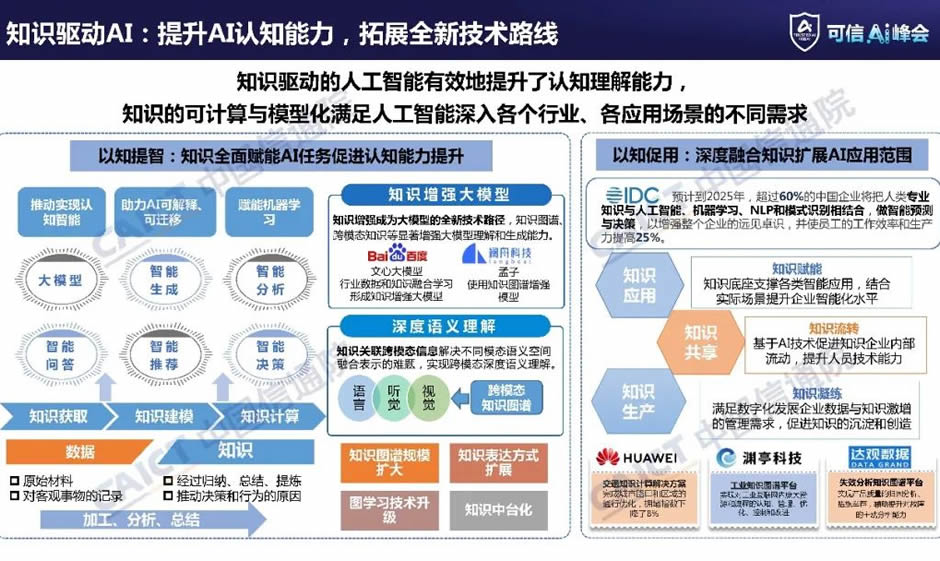 知識驅(qū)動助力人工智能認(rèn)知能力的提升,滿足人工智能深入各個行業(yè)不同應(yīng)用場景的需求。隨著深度學(xué)習(xí)與知識圖譜等多重技術(shù)的深度融合,綜合利用大量知識數(shù)據(jù)中的因果和邏輯關(guān)系,可以助力人工智能認(rèn)知能力的提升,來解決人工智能深入各個行業(yè)時場景復(fù)雜、可解釋性較低等問題。在技術(shù)方面,知識和數(shù)據(jù)雙輪驅(qū)動的人工智能技術(shù)路線展現(xiàn)了強(qiáng)勁的發(fā)展?jié)摿,知識的融合應(yīng)用有效地提升了智能問答、智能推薦、大規(guī)模預(yù)訓(xùn)練模型等人工智能技術(shù)中的效果。文心大模型、孟子大模型等均嘗試?yán)弥R增強(qiáng)技術(shù)路線提升效果。在應(yīng)用方面,知識與人工智能的融合拓展了人工智能的應(yīng)用范圍,促進(jìn)形成知識凝練、知識流轉(zhuǎn)、知識賦能閉環(huán),推動數(shù)字化發(fā)展下行業(yè)與企業(yè)各類知識的沉淀、流轉(zhuǎn),顯著提升實(shí)際場景的智能應(yīng)用水平。