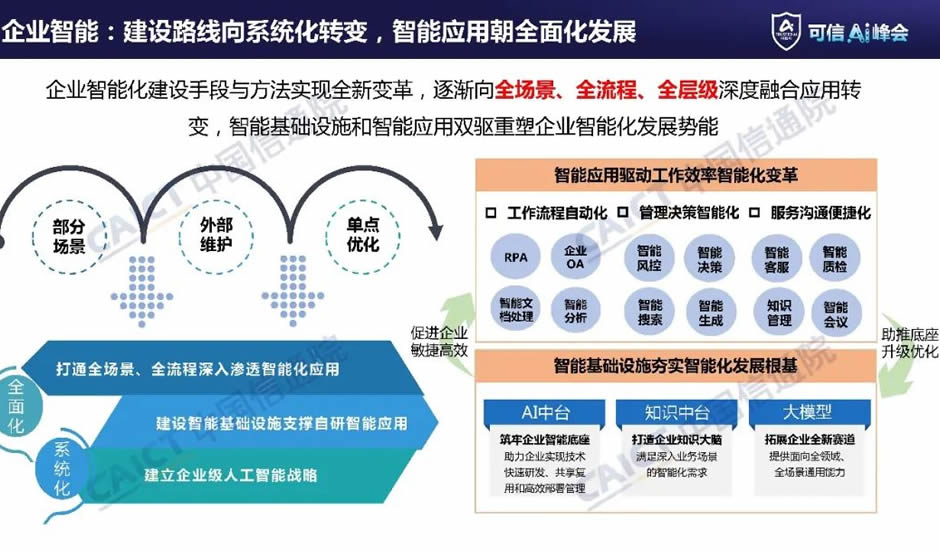 另一方面,智能文檔處理、智能會議、知識管理、智能客服等各類企業(yè)智能應用不斷發(fā)展,多面賦能企業(yè)辦公、管理、決策、風控、營銷、服務等各個環(huán)節(jié),促進業(yè)務的數(shù)據(jù)化與知識化、工作流程的信息化與智能化。智能基礎設施和智能應用相輔相成,智能基礎設施促進智能應用的敏捷G效,智能應用助推智能基礎設施底座的升級優(yōu)化,共同推動企業(yè)智能化的加速發(fā)展。