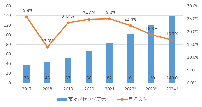 2017 年以來, 特種機(jī)器人產(chǎn)業(yè)規(guī)模年均增長率達(dá)到 21.7%, 預(yù)計 2022 年特種機(jī)器人市場規(guī)模超過 100 億美元, 2024 年特 種機(jī)器人市場規(guī)模將有望達(dá)到 140 億美元。