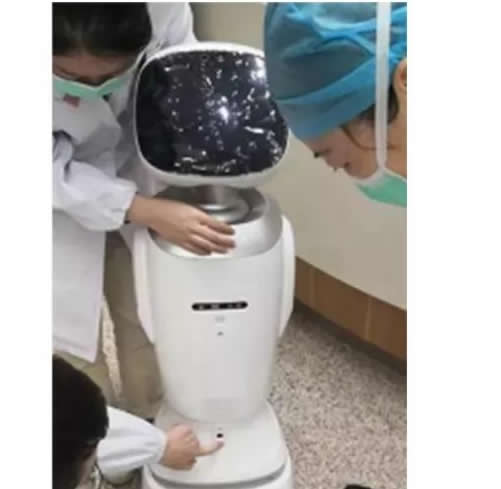 輪式移動(dòng)機(jī)器人,可在無接觸情況下查看病人電子病歷,調(diào)取檢查報(bào)告;同時(shí)具有安撫病患情緒、心理疏導(dǎo)等功能。