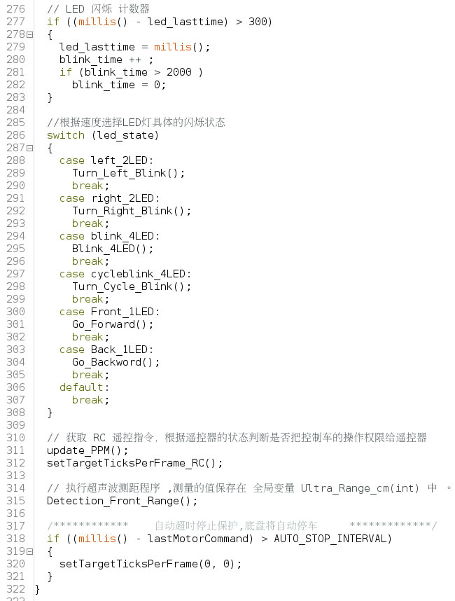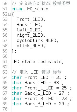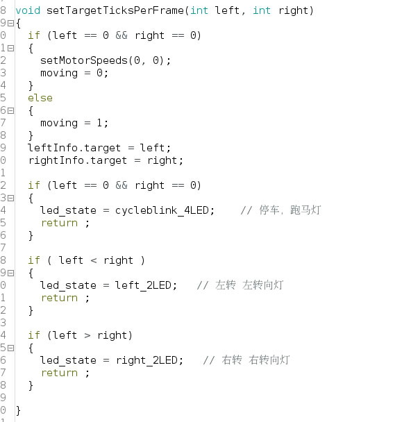 該部分代碼,說明了LED閃爍狀態(tài)的切換方式,其切換的依據是依靠左右輪執(zhí)行的速度差來決定的。如: