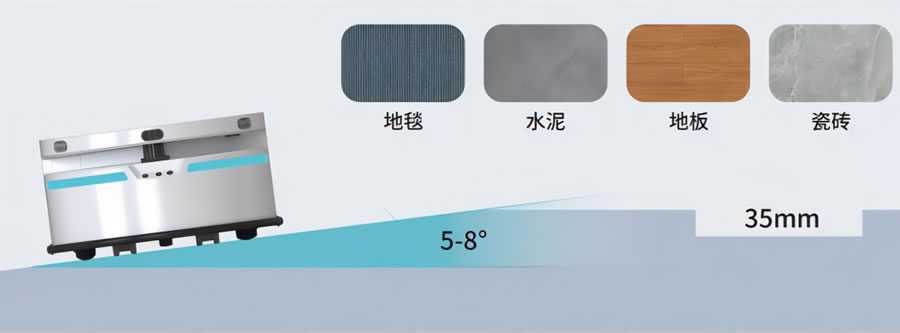 作為底盤界新星,創(chuàng)澤通用智能機(jī)器人底盤在負(fù)重、越障、爬坡性能方面同樣也表現(xiàn)優(yōu)異。除了在平地上擁有穩(wěn)定可靠的導(dǎo)航避障性能,在面對(duì)坡度、過坎這些障礙物時(shí),也擁有穩(wěn)定的行走性能,可以廣泛適用于地板、地毯、瓷磚、水泥等多種材質(zhì)地面,滿足J大部分場(chǎng)景應(yīng)用。