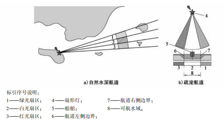 4. 1 根據(jù)船舶航行需要配布扇形燈時(shí),應(yīng)以簡明的方式,標(biāo)示出港池口門、航道、轉(zhuǎn)向點(diǎn)、其他航道連 4接點(diǎn)、錨地、水上功能區(qū)界限、礙航物區(qū)等。